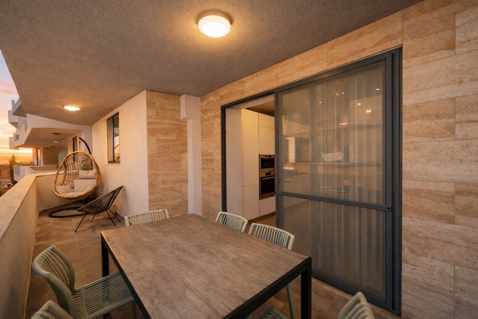 Large balcony with dining table